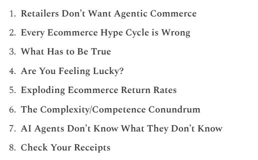ในบทความที่ชื่อว่า Agentic Commerce is a Collective Hallucination ผู้เขียนคุณ Andrew Lipsman อธิบายเหตุผล 8 ข้อที่ทำให้ Agentic Commerce ไม่เกิดง่ายๆ อย่างที่ทุกคนคิด