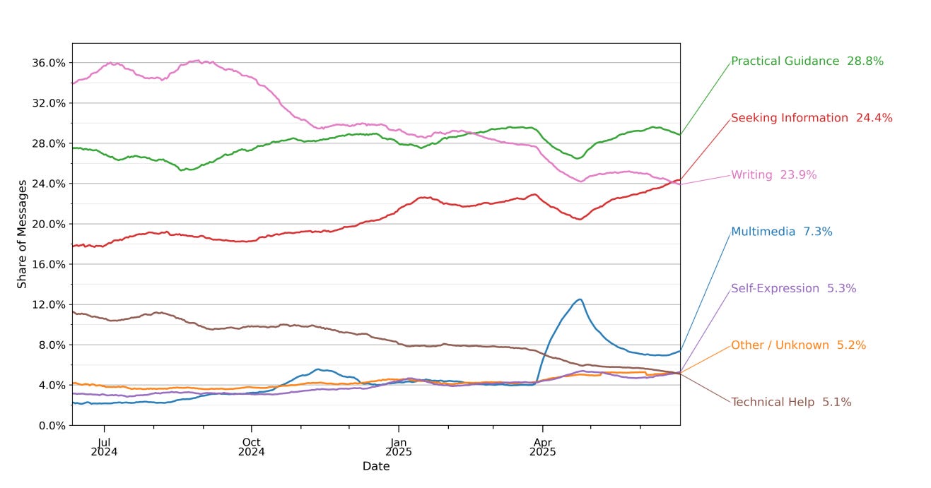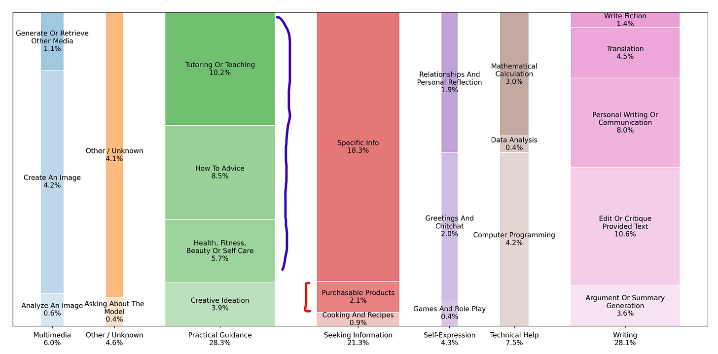ล่าสุด OpenAI มีออกรีพอร์ท How People Use ChatGPT ซึ่งแสดงให้เห็นว่าโดยรวมแล้วคนยังใช้ ChatGPT ในการซื้อสินค้าน้อยมาก แค่ 2% เท่านั้นเอง (ผมมาร์คเส้นแดงไว้) ต่อไปมันอาจจะเยอะขึ้นเรื่อยๆ ก็ได้ แต่ Use Case ของ ChatGPT นั้นเยอะมากกว่าแค่จะเน้น E-commerce เป็นหลัก แม้แต่ Google เองยังมีการเสิร์ชที่เป็นการสนใจซื้อของหรือบริการที่ประมาณ 15% เท่านั้น